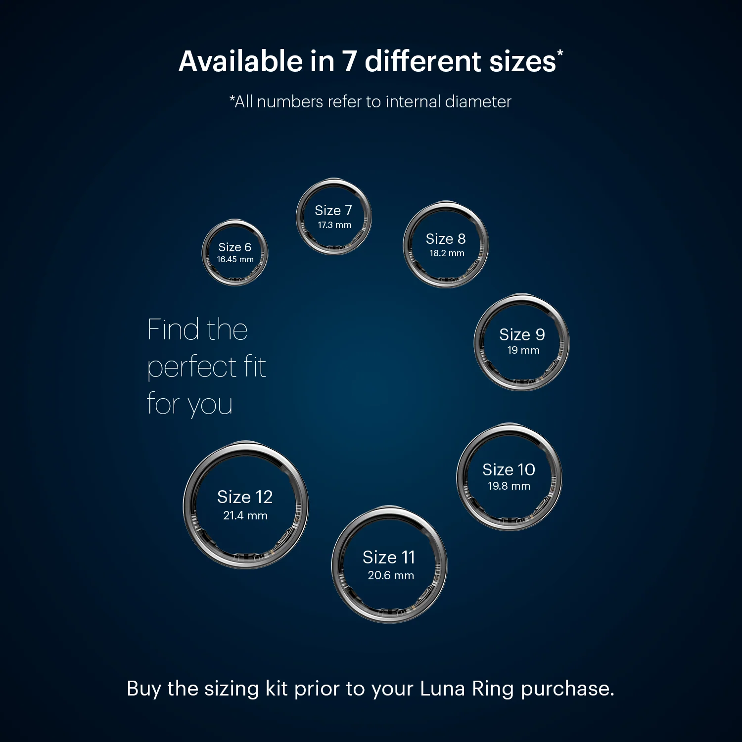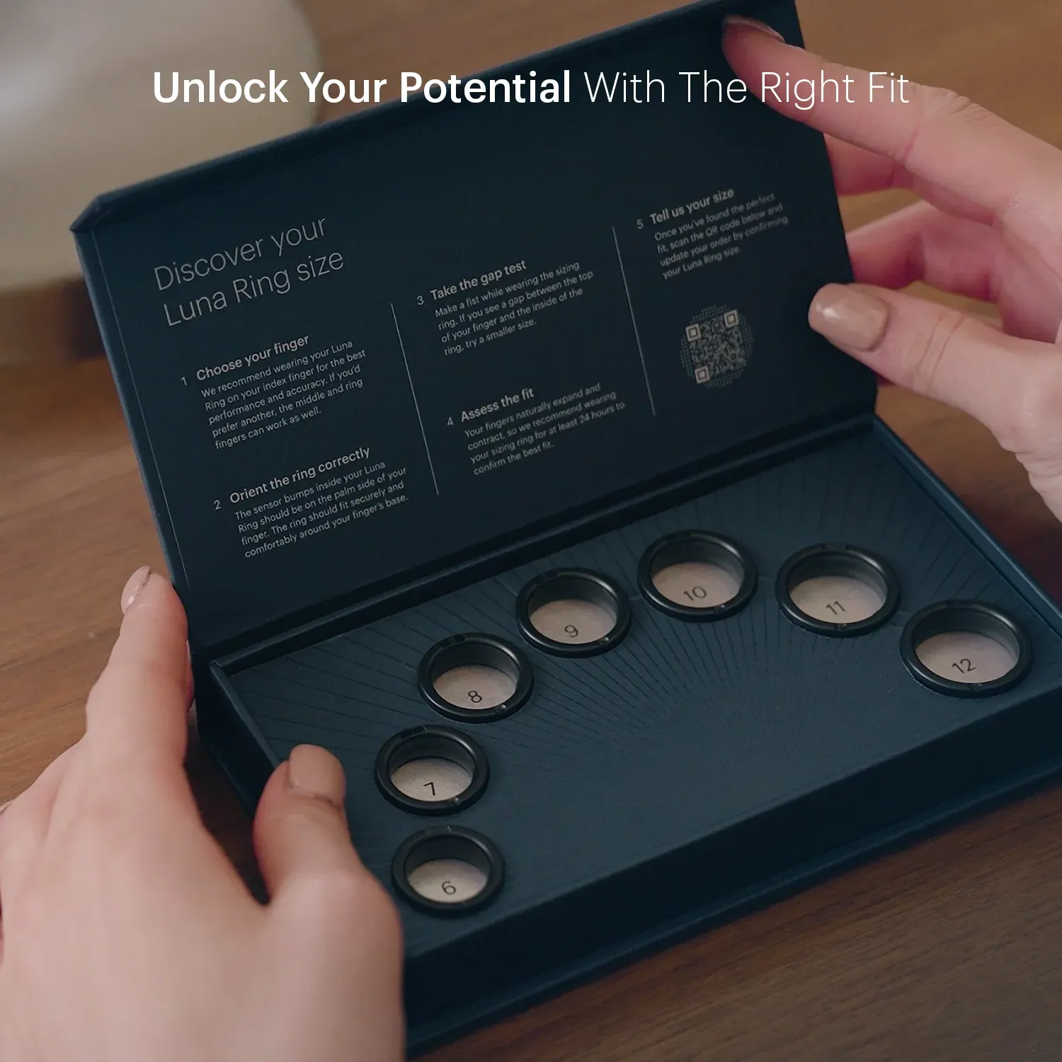 To find your ideal Luna Ring size, use our sizing kit, which includes a full range of sample rings. Follow the simple instructions in the kit to choose the size that fits your finger comfortably, especially in the morning when sizing tends to be most accurate. In case you do not have a sizing kit, fret not! Your purchase order include a complimentary sizing kit.