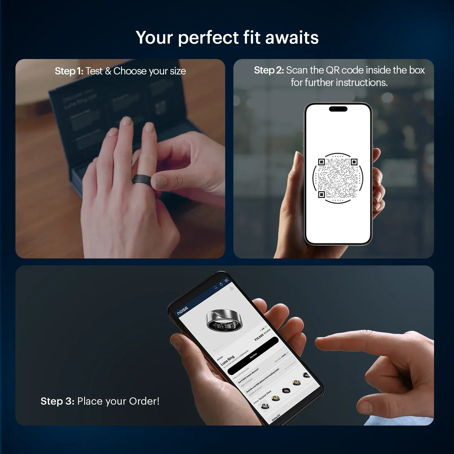 We first send a sizing kit with a QR code. Submit your size, color, and order ID using the QR code, and we’ll ship your Luna Ring once confirmed.